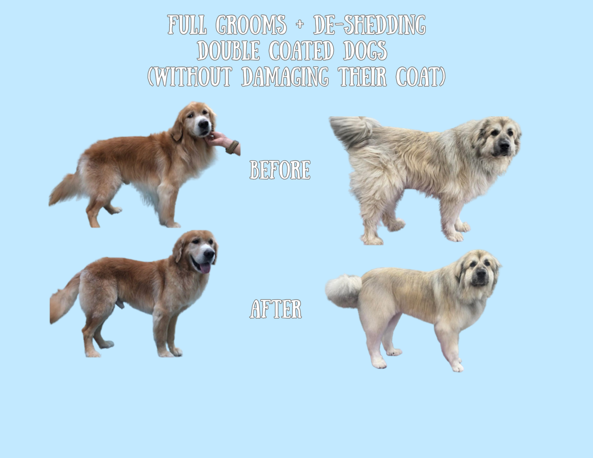 This treatment is especially beneficial for breeds such as Golden Retrievers, Australian Shepherds, Huskies, German Shepherds, Great Pyrenees, and other double-coated dogs.